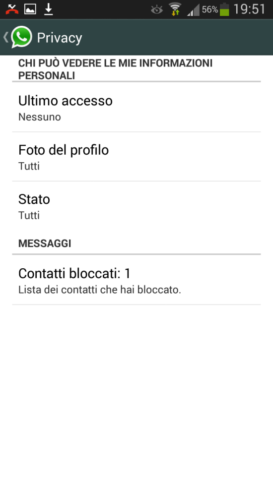Su Whatsapp Android è stata finalmente inserita l’opzione Privacy che consente, a ciascun utente, non solo la possibilità di nascondere l’ultimo accesso Whatsapp, ma anche l’opportunità di impedire la visualizzazione della foto del profilo e dello Stato. Le opzioni, per ogni singola voce sono Tutti, I miei contatti e Nessuno.